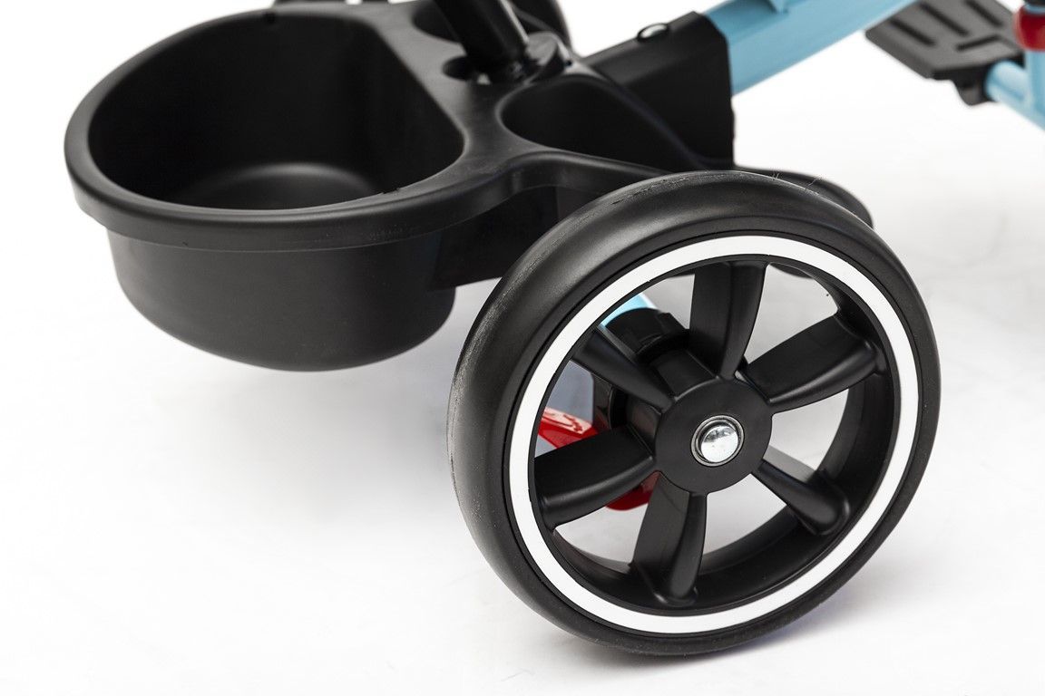 Kółka wykonane zostały z wytrzymałej plastycznej pianki w dotyku przypominającej, gumę, odporne na przebicia i nie wymagające pompowania. Tylne kółkach dodatkowo wyposażone zostały w blokadę zabezpieczającą rowerek przed niekontrolowanym przesunięciem się.